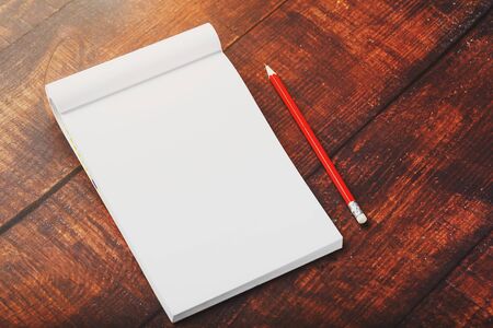 Notebook with a red pencil on a brown background with warm sunlight, for writing. Free empty space for writing on a blank sheet of a notebook, concept.