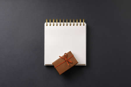 open notebook with gift on black background top view, notepad and a gift box on dark table, note with congratulations and present