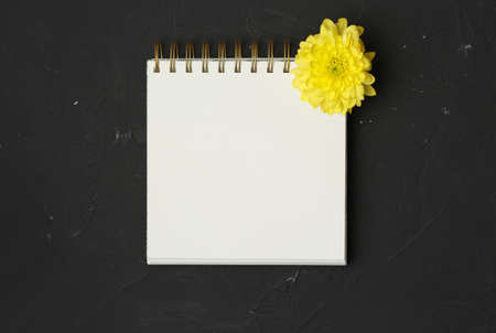 Top view of a open notebook, spiral notepad with blank sheet with Yellow chrysanthemum. Flat lay, spring background At blank copy space, over black background.