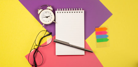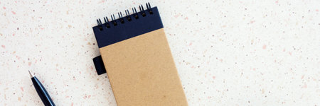 Notebook with pen on color paper background. Top view
