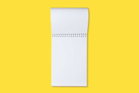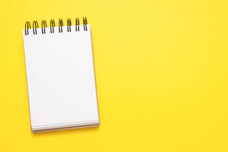 Blank page of notepad on the yellow flat lay background with copy space.