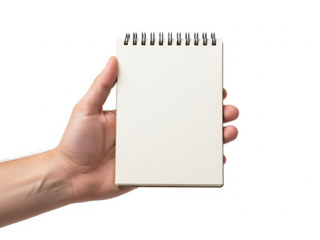Hand holding notebook isolated on white background