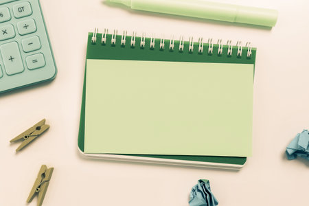 Still life, business, office supplies, education concept: Top view open notebook with blank pages