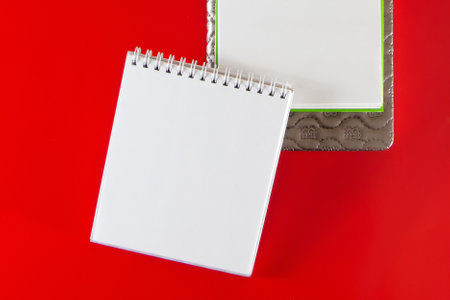 Minimalistic layout for design. Office supplies - notebooks and pens on a red background. Open blank notebook for your notes on a red background
