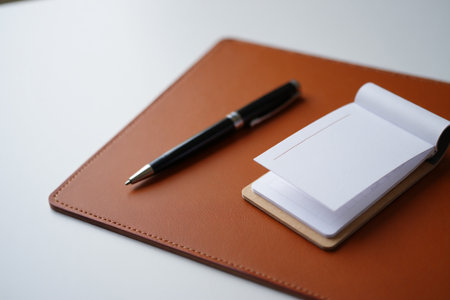 Pen and notepad on leather mat. Professional writing note organized office.