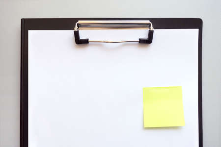 A folder for papers with a white sheet, a green sticker on a gray background