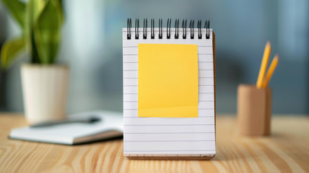 Schoo or office notebook on a yellow background. Mock up of spiral notepad on a table.