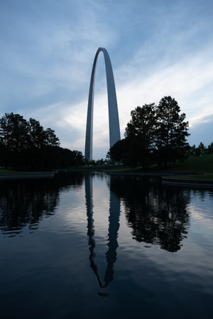 St. Louis, United States: June 12, 2018: Gateway Arch Reflects Over Dark Pond in Early Summer Morning
