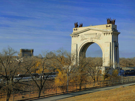 Volgograd, Volgograd region, Russia - 11.06.2021. The Arch of the Volga-Don Canal in the Krasnoarmeysky district