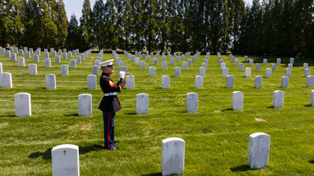 A poignant moment unfolds as a Marine plays taps, honoring a fallen veteran with a solemn salute, marking their internment at a national military cemetery.
