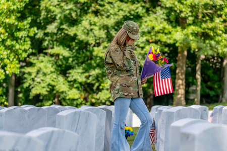 A poignant image of a soldier holding the American flag during sunset at a cemetery. A tribute to fallen heroes.
