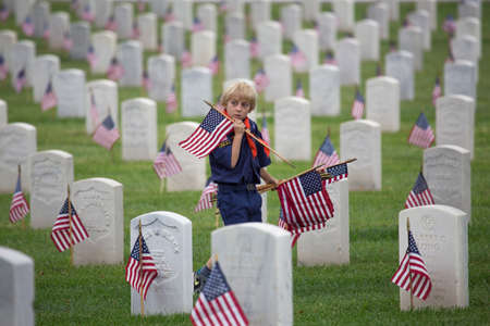 Cubscout places one of 85, 000 US Flags at 2014 Memorial Day Event, Los Angeles National Cemetery, California, USA