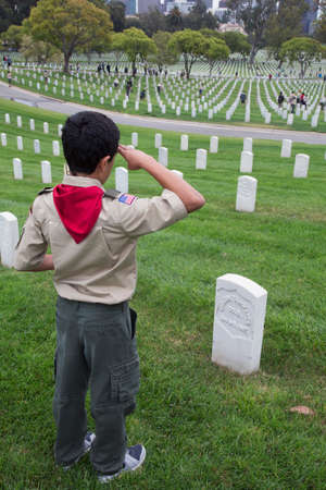 Boyscout salutes at one of 85, 000 US Flags at 2014 Memorial Day Event, Los Angeles National Cemetery, California, USA