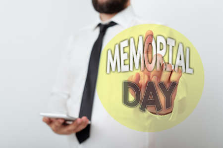 Handwriting text Memorial Day. Conceptual photo To honor and remembering those who died in military service Model with pointing hand finger symbolizing navigation progress growth
