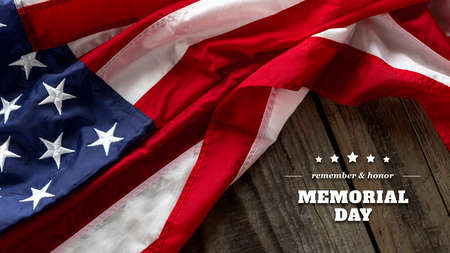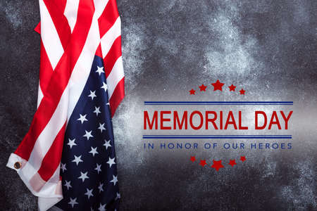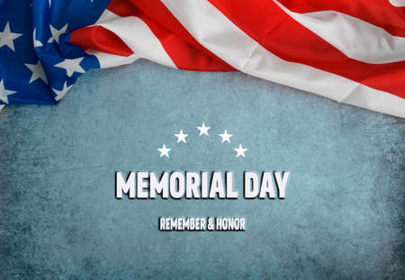 Close up of waving national usa american flag. The flag of the United Sates of America on a grey plank background with memorial day.