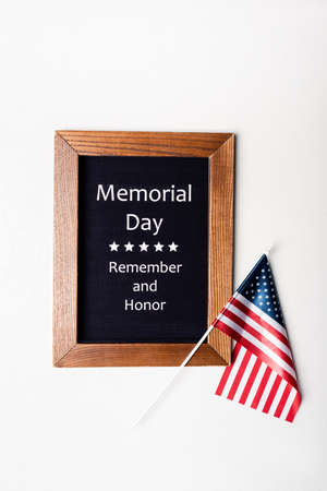 Top view of american flag and chalkboard with memorial day remember and honor lettering on white background