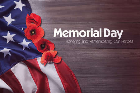 Memorial Day, Honoring and Remembering. American flag and red poppy flowers on wooden background, top view