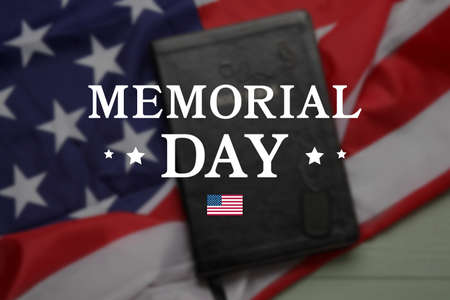 Text MEMORIAL DAY on blurred USA flag with Bible