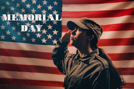 Memorial day. A female soldier in uniform salutes against the background of the American flag with the inscription Memorial day. Side view. The concept of the American national holidays and patriotism.