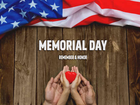 Happy Memorial Day concept. American flag and inscription with congratulations against a wooden background.