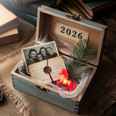 New Year. Time capsule. Black and white photos and ltst from ancestors to descendants.
