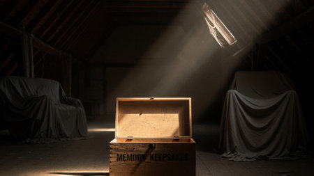 A weathered wooden box sits open near a window, revealing a collection of vintage black-and-white photographs. Dust particles dance in the sunlight filtering through the glass.