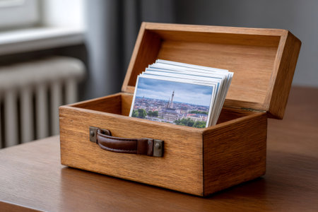Wooden box filled with postcards, symbolizing travel, memories, and collecting souvenirs