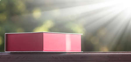 A classic wooden card catalog box sits on a rustic table, bathed in the warm, golden glow of morning sunlight.