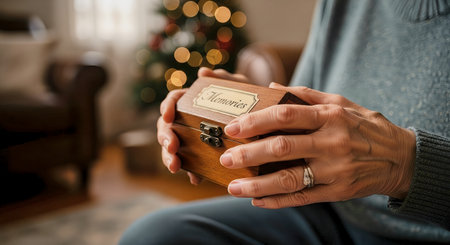 Close up of hands holding a small wooden box labeled Memories with warm bokeh lights in the background. Suitable for seasonal, nostalgic or lifestyle themed projects.