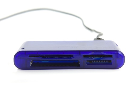 Close-up of USB card reader isolated on white background.
