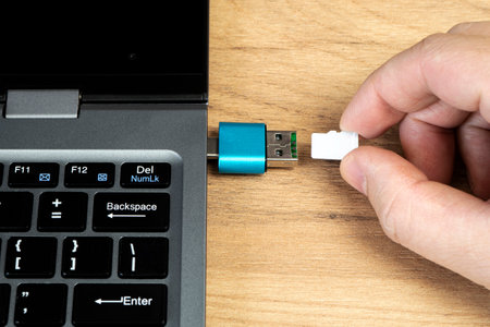 Hand connecting memory card into laptop computer with usb slot