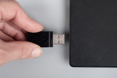 hand man hold Flash drive connect to USB port plug-in computer laptop for transfer data and backup business concept