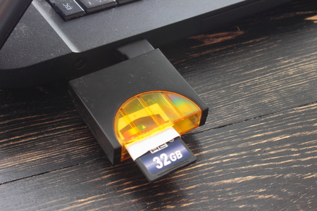 SD memory card on table beside laptop computer and card reader