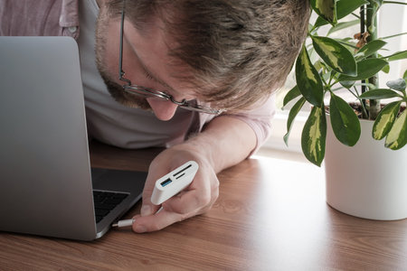 Man connects a memory reading card reader to a laptop, in a home interior.