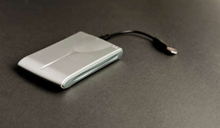 Closeup external hard drive on wooden desktop. Working with external hard drive.
