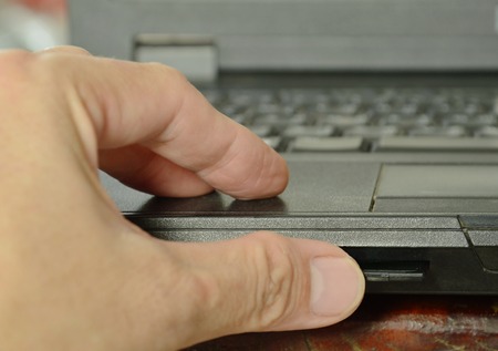 thumb pressing SD card put in computer notebook multimedia reader