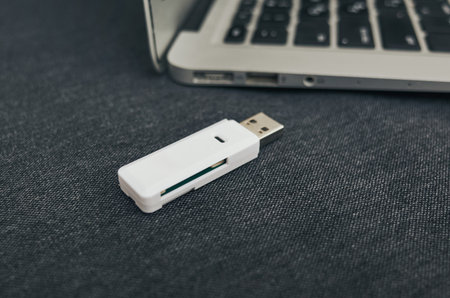 Card reader with micro sd card lying on gray table next to white laptop, composing flat lay still life representing storing, transferring and managing digital data. Concept of computer hardware