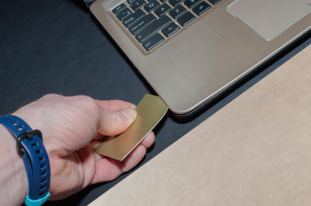 Hands of a computer repairman removing the back cover of the notebook.Computer repair shop. Engineer performing laptop maintenance. Hardware developer fixing electronic components. PC technology