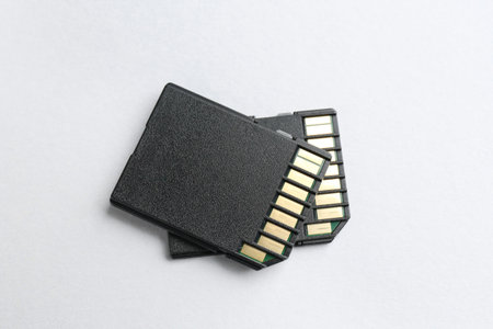 Two SD memory cards on white background, top view