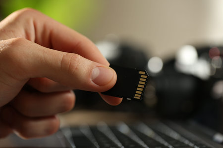SD memory card on table beside laptop computer and card reader