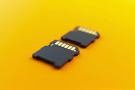 Two small memory cards rest on a vibrant yellow background, showing their compact design. These devices embody advancements in digital storage, perfect for photography and media.