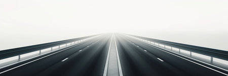 Foggy rainy highway road, low poor visibility, accident danger warning.