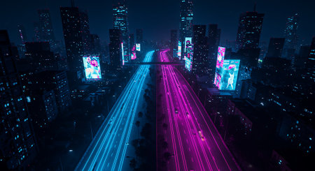 Captivating nighttime view of a busy highway illuminated by vibrant light trails, showcasing modern skyscrapers and the dynamic energy of urban life.