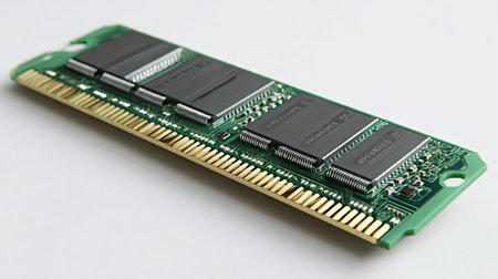 Ram memory module featuring integrated circuit chips and golden contacts on a green circuit board, signifying modern computer hardware for data processing and storage capacity
