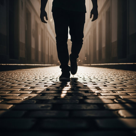 A close-up of the legs and shoes of an adult man walking along a country road, captured from behind with a low-angle view at sunset. The focus is on his black jeans and white sneakers as he walks towards us in the distance. In front of him lies a green meadow, and trees line both sides of the path. Warm, golden sunlight bathes everything around it. --chaos 30 --ar 16:9 --v 6.1 Job ID: 1c06b93d-2f3a-47b7-b475-27fb96503b2f