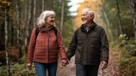 Elderly couple walking hand in hand in a peaceful forest, reflecting companionship and emotional healing.