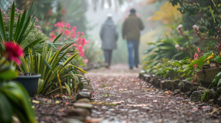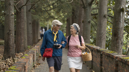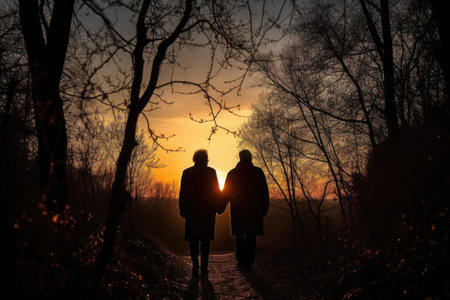 Two senior individuals stroll hand in hand on a peaceful path surrounded by vibrant trees and warm sunlight in the evening.