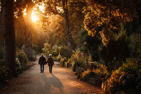 Two elderly individuals stroll hand in hand along a winding path in a park. The golden sunset casts a warm glow through the trees, creating a tranquil atmosphere.