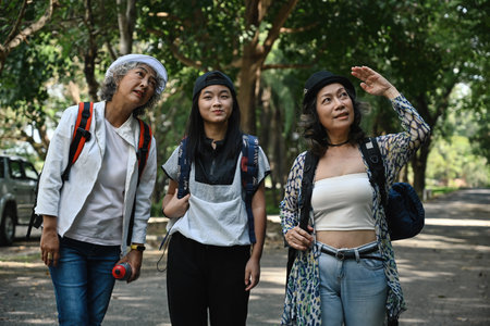 Granddaughter and two grandmothers on a forest walk, looking around curiously. A joyful multi-generational hiking trip on a sunny day.