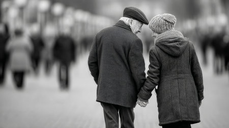Elderly Couple Walking Together Hand In Hand, Sharing Joyful Moments In Peaceful Urban Setting